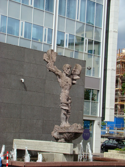 Кстати, вообще искусство Норвегии несколько… непривычно, что означают некоторые композиции просто трудно сказать. Хотя есть и вполне традиционные скульптуры. Городок маленький, постоянно происходит ситуация типа «мама, опять наша булочка». Тут нас застал внезапно налетевший дождь. Кстати, после дождя заинтересовали меня парочка муниципальных служащих, ходивших по улицам и тщательно записывавших местоположение всех луж. Это нормально? Это разве можно так жить!? На фото один из них в оранжевой куртке.