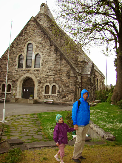 Нашли серокаменное большое здание легко. Только хотели его получше рассмотреть, как начался дождь. Мы впервые попали в сильный дождь на улице. Наша машинка стояла далеко, никаких открытых общественных заведений (ни кафе, ни магазинов) поблизости не было. Мы в первый раз надели дождевики для защиты, именно от дождя и ветра.