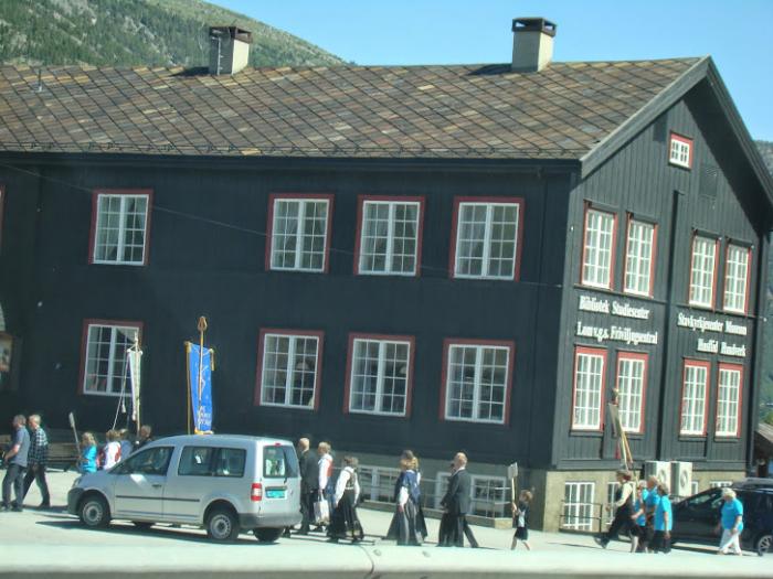 и вот опять Фоссбергом (главный город коммуны Лом, по имени которой его и называют частенько Лом). Внезапная пробка – оказывается какой-то местный праздник, на шествие по поводу которого вышел едва ли не всё почти двухтысячное население городка! С хоругвями, в национальных одеждах…