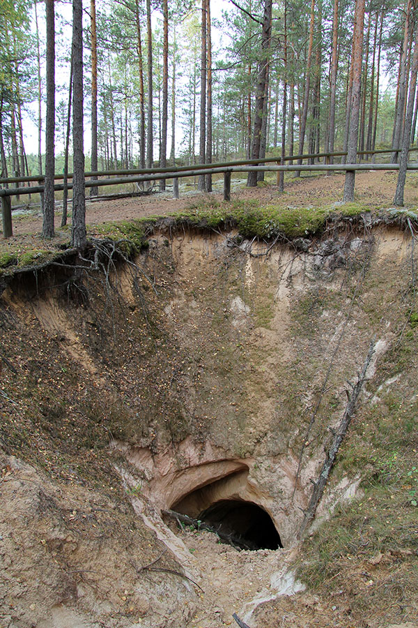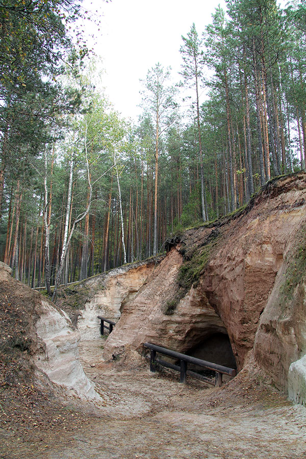 Песчаник тоже чуть-чуть отличается. В Печорах он пронизан тонкими красными пластами (в которых выше содержание солей железа). ИМХО, именно эти прожилки обеспечивают прочность печорским пещерам. В пиузе песчаник более однородный, белый. Но и менее прочный. Пещеры получились недолговечные, сейчас они постепенно разрушаются. Поэтому пещеры какое-то время были вообще закрыты для туристов (только этой весной снова открыли смотровую площадку, но в глубь пещер все равно не пускают). Их как могут спасают, колоны покрывают какой-то упрочняющей шубой, но все равно периодически случаются обвалы.