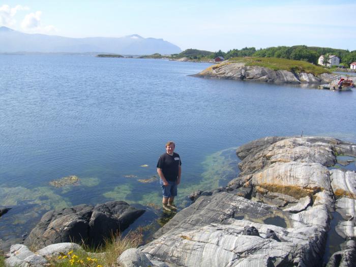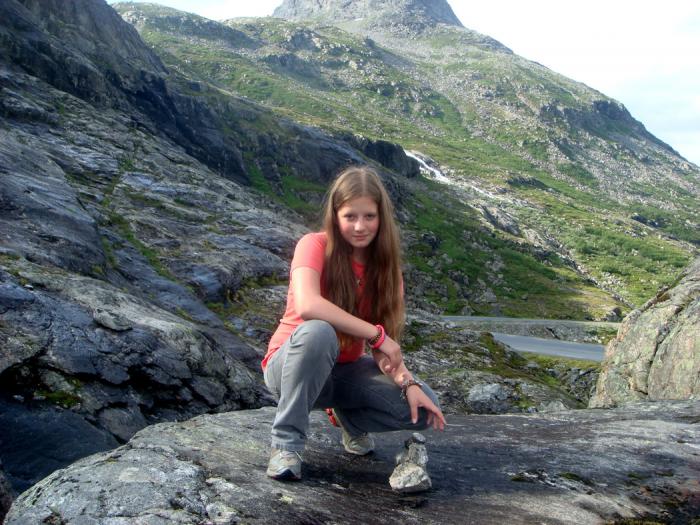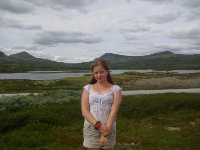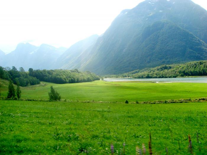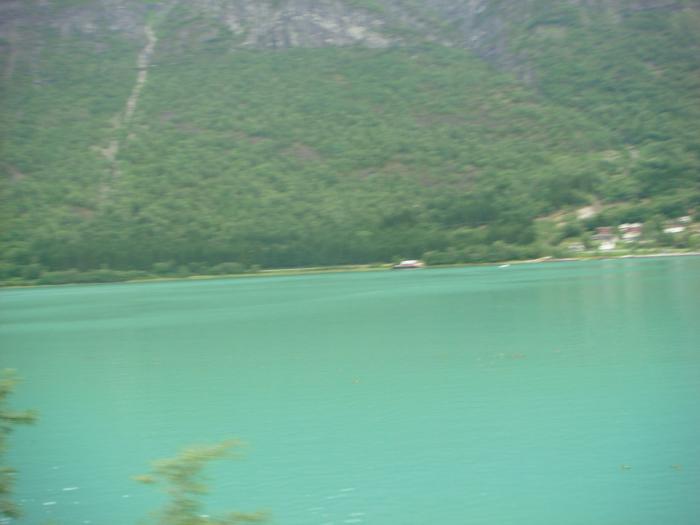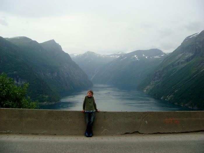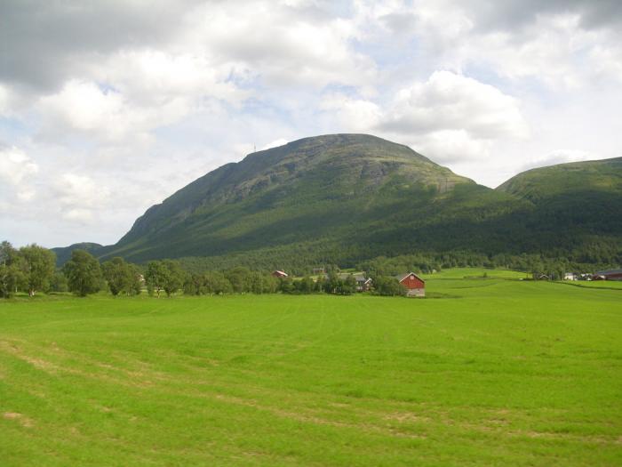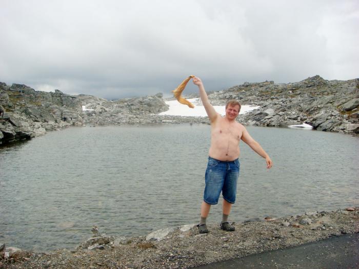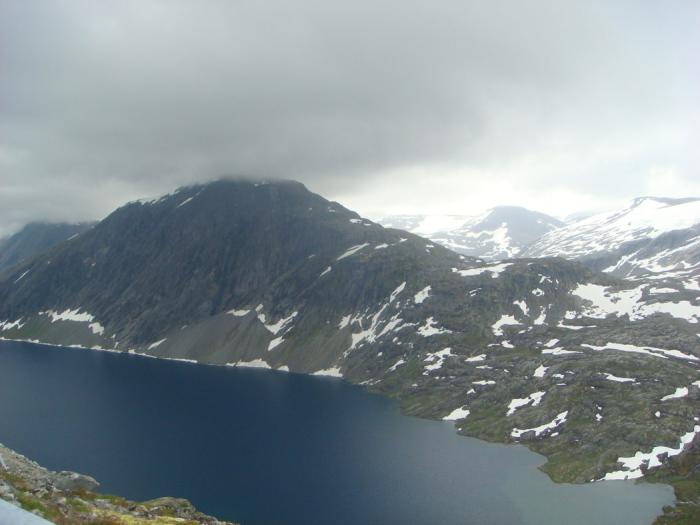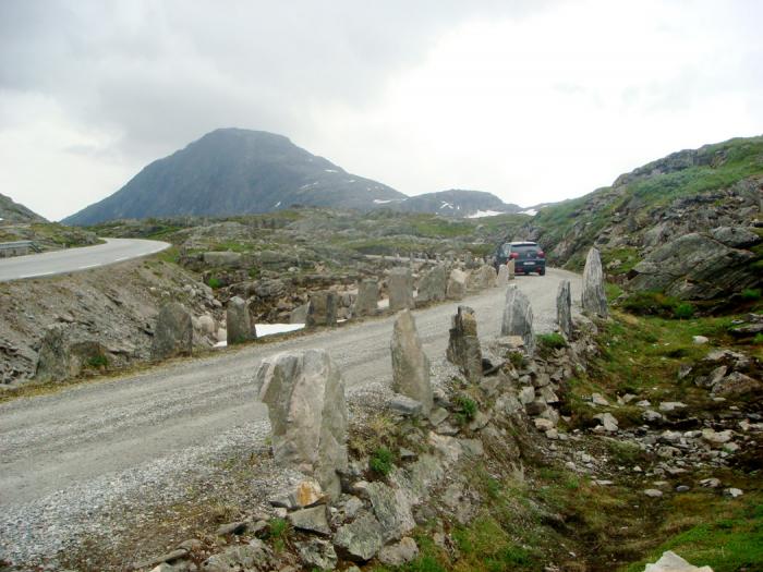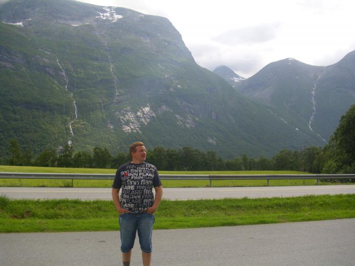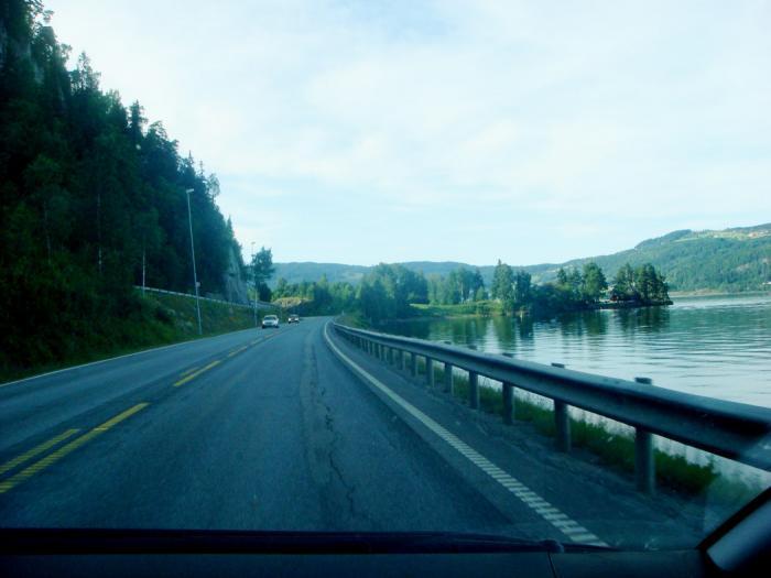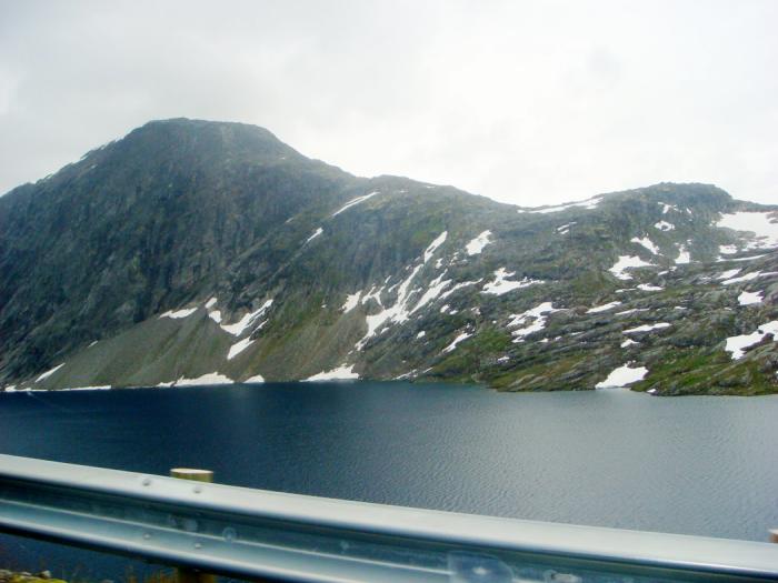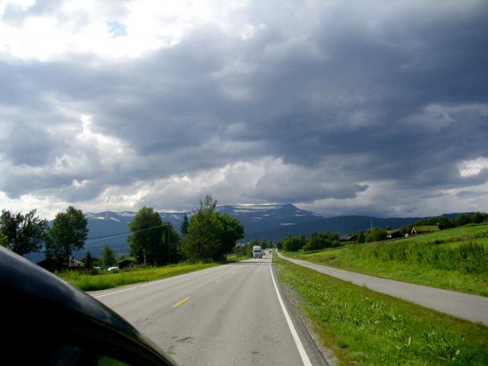 16-14. 3153 км. Заправились на 550 крон () литров. Дороги Лилихамера оказались лишь прелюдией к настоящим горным дорогам. Но я потихоньку осваиваюсь. Немного нарушаю. Не только машина улучшила свой аппетит в здоровом климате Норвегии. Свежий воздух и моцион пошли детям на пользу. Едят очень хорошо. Такими темпами приготовленных запасов не хватит, подкупаемся. О природном туризме можно говорить много, но лучше смотреть. Как описать виды представшие пред нами. Первый перевал, на который мы забрались. Первый обгон на горном серпантине (Это был трактор с бочкой навоза, невозможно было ехать за ним). Жителю равнины горный пейзаж непривычен и ласкает взгляд. Все вокруг необычно, все вызывает восторг. Останавливаемся, благо время позволяет, лицезреем открывающиеся виды на горные озера и речки. Необыкновенно красив и гармоничен мир вокруг нас.