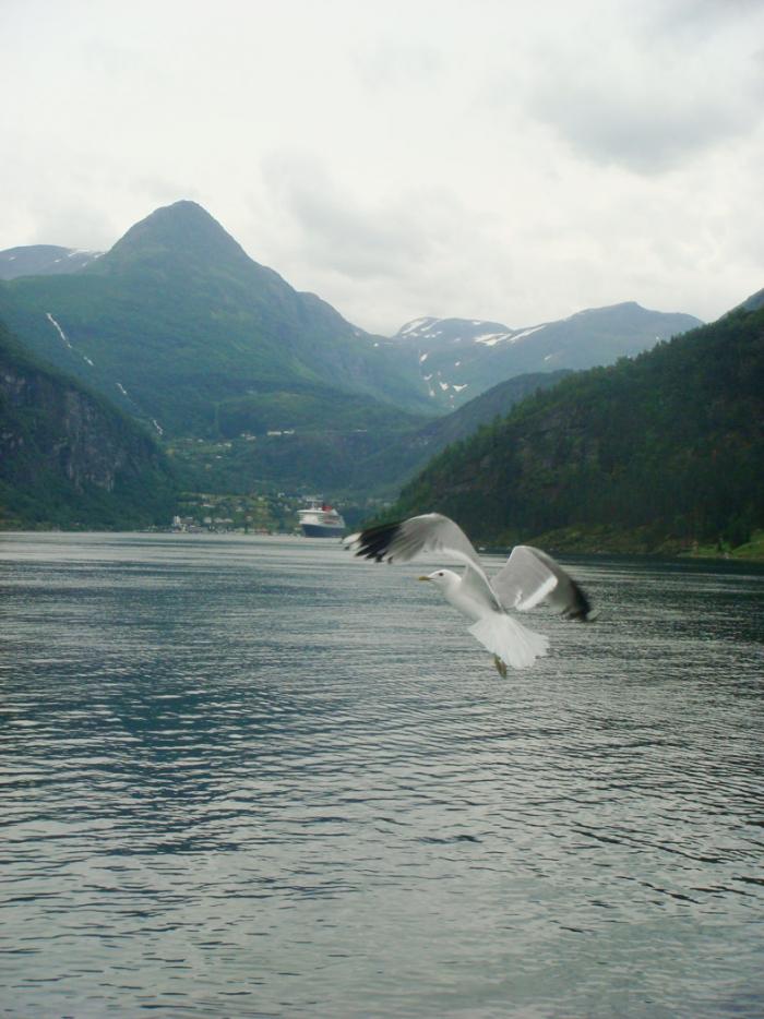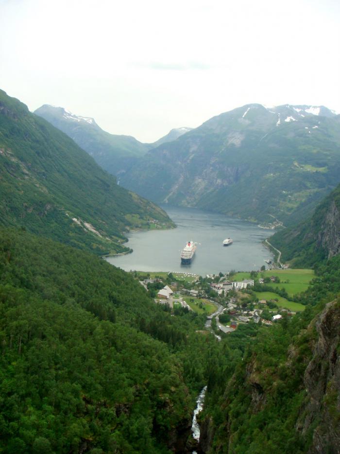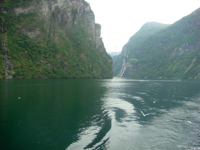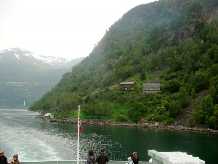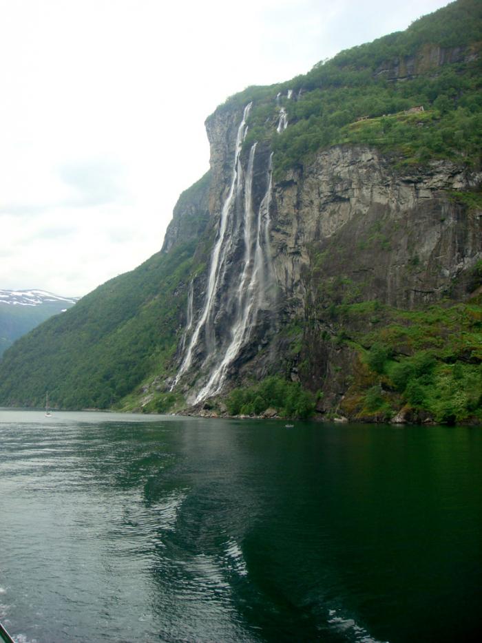 12-25. 3709 км. Бак пока полный. Следующий паром туристический. Совмещаешь полезное с приятным. Получается прогулка по фьорду. От Хелесита до Гейрангера и длится приблизительно час. Стоит семейный пакет 570 крон. Вроде как дешевле получается чем по отдельности все оплачивать. Водопад пять сестер, скала — лицо человека, домики людей, к которым можно добраться только с моря. В конце концов сам фьорд, все это достойно внимания. Не смотря на моросящий дождик все на верхней палубе, любуются красотой. Так весь час и простояли.