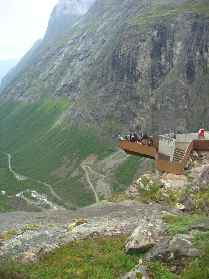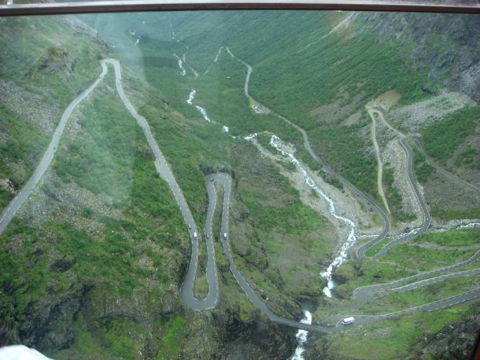 17-40. 3489 км. Прошли мы лестницу троллей и чертов мост. Развлеченьеце, ипона мать. Атракционцик. Тому, кто решил сделать это достопримечательностью надо в голову гвоздь на 200 забить, Валентине на 150 за то, что притащила, а мне на 120, за то что согласился. Бедный пикасик ревел своим мотором, выдавая всех имеющихся в наличии лошадей. Я несколько раз порывался закрыть глаза со страха, но Валентина заставляла меня фотографировать, снимать на камеру и еще что-то делать, сейчас уже не помню что. Седых волос у меня на груди прибавилось. Я вам что то втирал про горные дороги, так вот, это был детский лепет. Здесь все гораздо хуже. А обзорная площадка висит над пропастью и пол у неё решётчатый, а перила стеклянные. Но Валентина загоняет меня на неё фотографироваться, А дети относятся ко всему спокойно. Бегают по этой площадке, как ни в чем ни бывало. Хорошо, что спускаться будем другой стороной, пологой. Через клубничную долину.