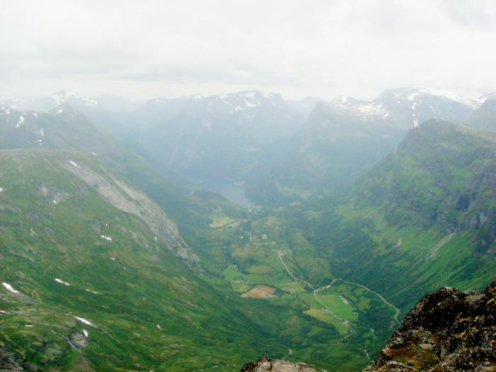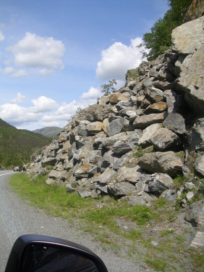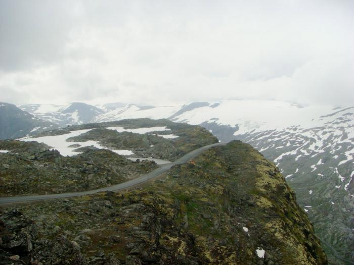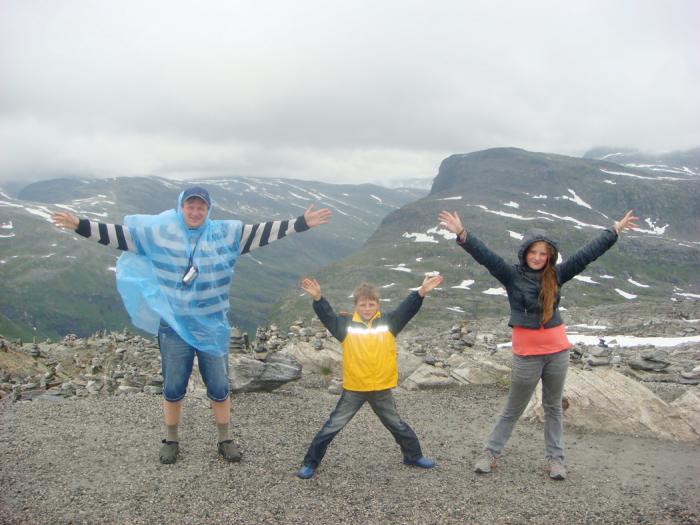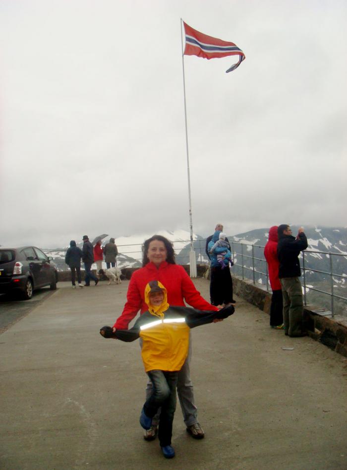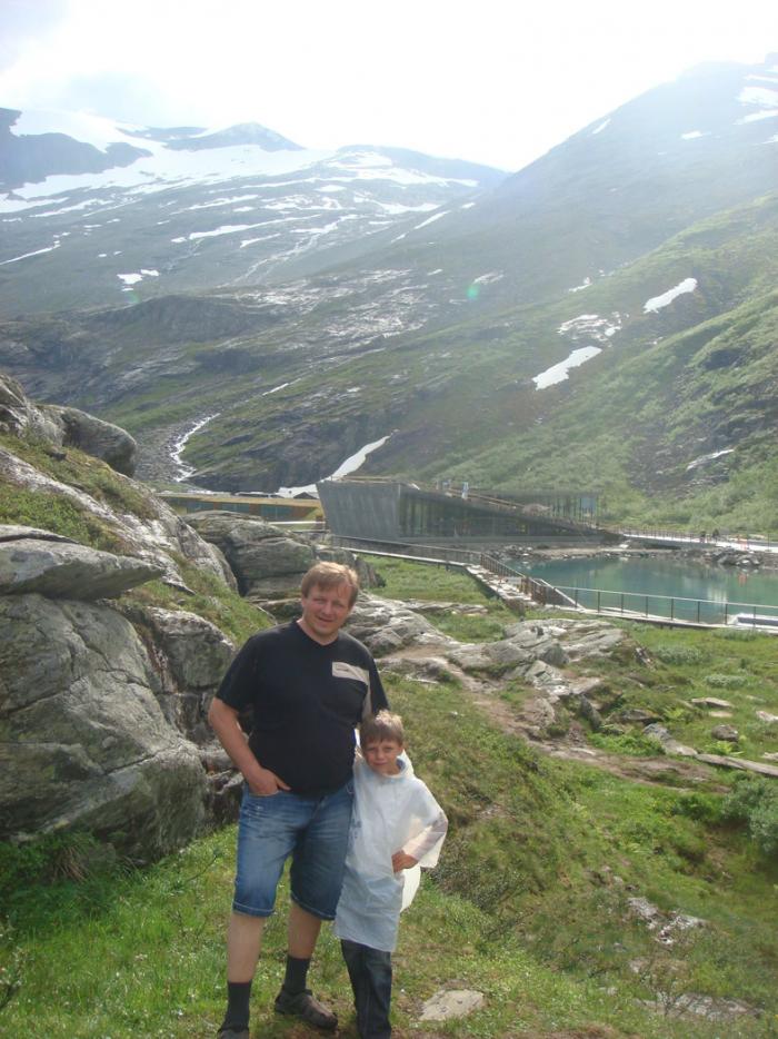 15-30. 3741 км. Спускаемся с горы Далсниба. На вершине, лох пархатый, от восторга и избытка чувств забыл засечь километраж и время. Высота вершины приблизительно 1500 метров, температура воздуха 12 градусов и ветер с моросящим дождем. Вся вершина усеяна пирамидками. Это у них фишка такая, пирамидки строить. Мы это еще на Лестнице Тролей заметили. Аня прониклась и тоже стрит пирамидки. А Федя все в снежки играет. Далсниба напоминает Лестницу Тролей, но вид с вершины другой. Да и смотровая площадка не висит над обрывом. Дорога не показалась такой страшной как на Лестнице Тролей. Может потому, что приноровились, может потому, что сам был за рулем. Въезд на смотровую площадку платный, 100 крон. Спускаемся снова пологой стороной, у воды горных озер нереально синий цвет. У воды фьордов зеленый.