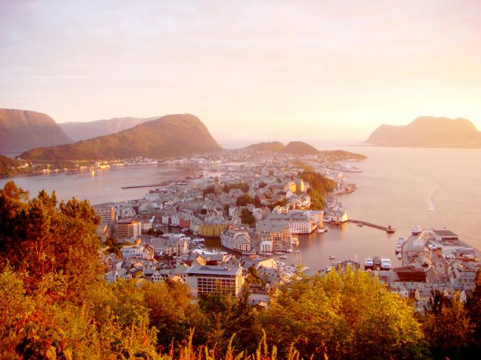 10-05. 3621 км. Выезжàем из Алесунда. Города оставившего в памяти двоякое впечатление. Заправляемся на выезде 38 л по 14.39 крон. Вчера, по прибытии в отель Скандик, выяснилось, что у них в системе прошел сбой и нас перемещают в другой отель. Что бы объяснить мне это, девушка на рецепции писала мне на бумажке, потому что такие длинные фразы я на слух не воспринимаю. Оказалось направляют нас в Рицу. Но за те же деньги. Вроде неплохо. Но по прибытии в Рицу выясняется, что Скандик не предупредил, что у нас была предоплата. Со словарем в руках объясняю это уже девушке в Рице. Валентина уже настроилась скандалить. Но с ними скандалить невозможно, говорит дайте мне ваш ваучер и я разберусь. Ваучер забыли в Скандике. Не проблема, вот интернет, скинте мне на почту из интернета. А пока я буду разбираться, идите в номер. Мы говорим, будем ждать пока проблема разрешиться. А она говорит, что нет проблемы, идите живите. Раз вы говорите, что платили, значит так оно и есть, мы разберемся. Номер в Рице это вещь. Две жилые комнаты. Ковры, мрамор, картины. Отдельная большая 2-х комнатная ванная. Крем для тела, бальзам для волос. Шикарно. Побросали вещи в номере и пошли посмотреть город. А город буквально кипит. Много народу на улицах, особенно возле баров. Из окон раздается громкая музыка и звон стаканов. Нам как-то все это по другому представлялось. Поднялись на гору Аксла со смотровой площадкой наверху. Рица расположена аккурат у подножия горы. Причем сначала хотели пешком, но оценив высоту решили на машине. Навигатор туда пути не знает, а карту забыли в номере. Доехали по указателям. Вид на город сверху, закат, океан. Все тридцать три удовольствия.