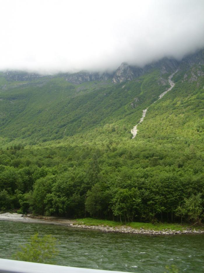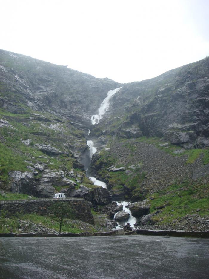 9-40. Стартуем в сторону атлантической дороги. Валентина с утра сама накормила и собрала лагерь и еще села за руль. У меня полный расслабон и отдых. Пока. Пошли длинные тоннели по 6 км. Под горами. Ощущения, что над тобой огромная гора поддавливает на психику с непривычки. Природа продолжает поражать. Водная гладь горных озер, горы, высотою выше облаков, облака ниже гор, водопады. Все это в одном кадре. Даже не осознаешь, что именно завораживает твой взгляд. Нельзя разделить панораму на части, и этой своей целостностью, она и необычна. А тоннели значительно облегчают жизнь. А облака царапают макушку.