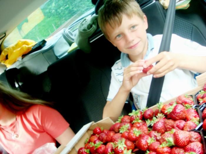 А через полчаса остановились купить свежевыращенной клубники с грядки. 25 крон корзинка. Мы купили ящик, так дешевле. И вот, лопая клубнику, отправляемся на ночлег в Алесунд.