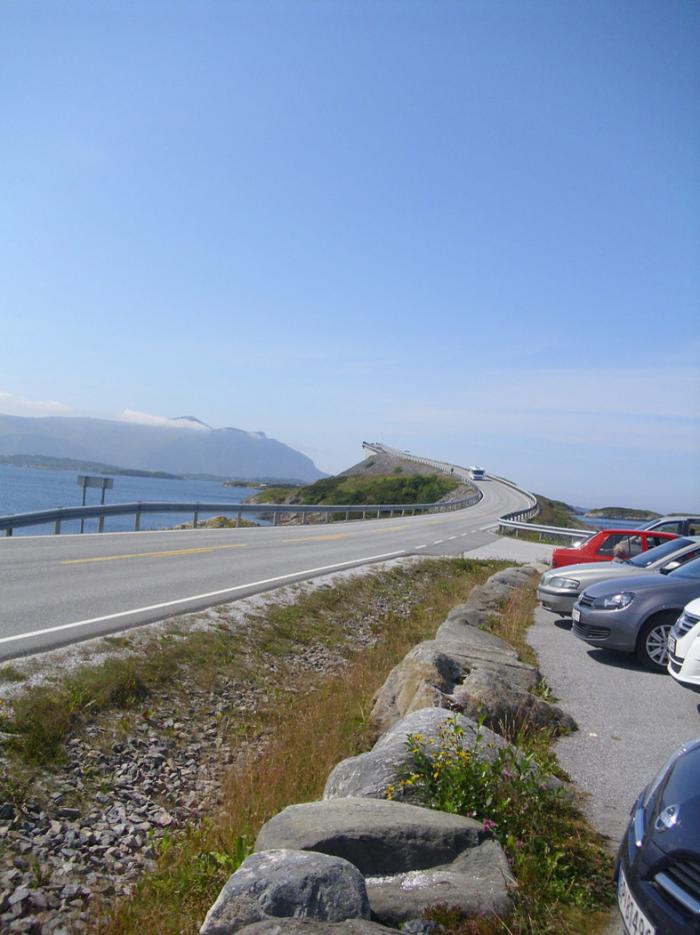 13-24. 3369 км. Знаменитая Атлантическая дорога с немение знаменитым горбатым мостом. Апофеоз нашего путешествия и экватор. Именно его так хотела видеть Валентина, что затащила нас на край света. На гребне моста она визжала. Я так понял, что от избытка чувств. Федя ей вторил, ему просто нравилось, что мама визжит. Стараясь сделать кадр поэффектней я таки кунулся в Атлантику. Не совсем, но достаточно, что бы почувствовать её холод. Достаточно сказать, что шорты намокли. Сочетание природной красоты с творением рук человеческих неплохо удается норвегам. Русских в достатке. Тоже наверно прибыли сапоги в Атлантике помыть.