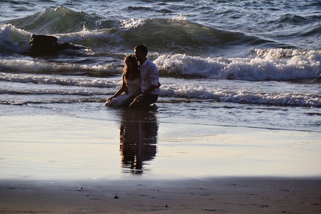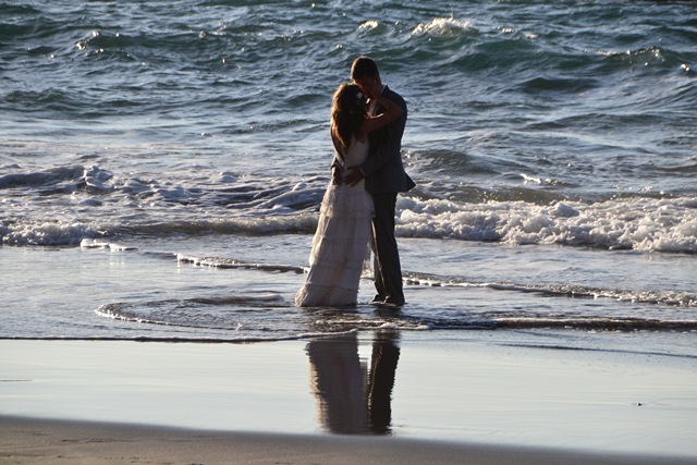 Но на каком-то этапе фотограф усадил счастливых новобрачных в воду и заставил их живописно брызгать друг на друга водой из набегающей океанской волны: