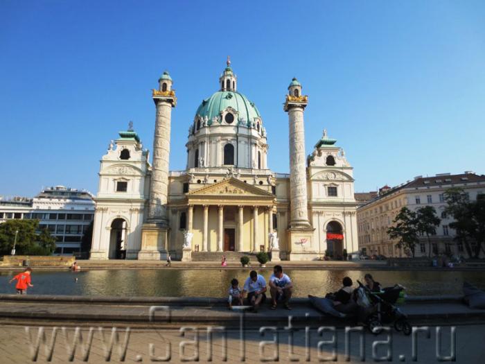 После небольшого захода в отель решила покататься на трамвае. Он проходит по самому центру города. Выходила 2 раза. В первый раз осмотреть Карл Кирхе, которая своими куполами и башнями-минаретами больше похожа на мечеть. Рядом с ней находился большой фонтан, на бортиках которого расположились люди. Некоторые были с большими надувными матрасами, но не для купания, а для спанья. То ли бездомные, то ли сибариты. Рядом с фонтаном был источник с вкуснейшей холодной водой.