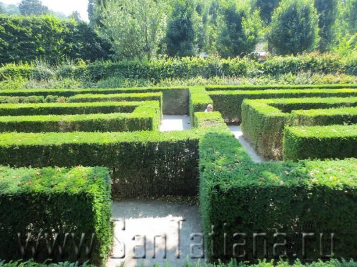 Лабиринт представлял собой извилистые коридоры из аккуратно подстриженного кустарника, над которыми возвышались головы гуляющих там взрослых людей. А вот дети бегали там совершенно невидимыми. Мне понравился вид сверху.