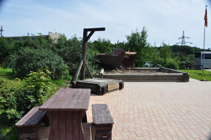 Песочница с отработанной породой для туристов, висилица для «расхитителей социалистической собственности» и столик для отдыха.