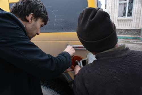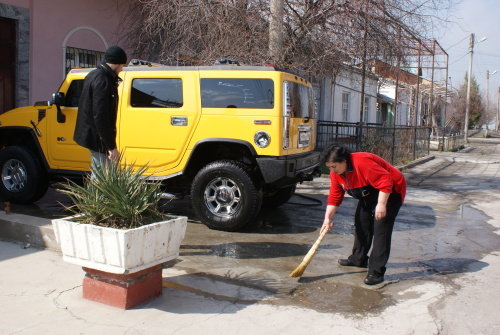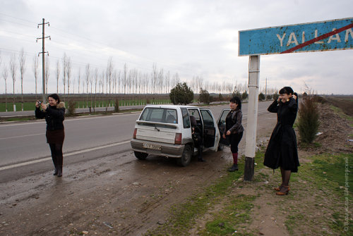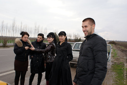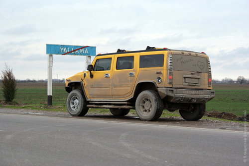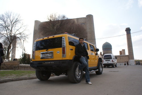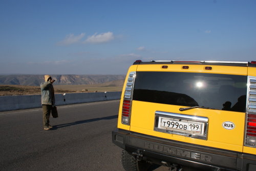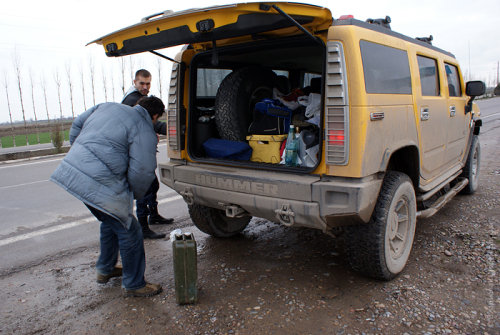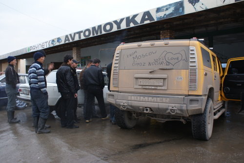 Но не тут–то было. Мы не примерили воронку перед отъездом. Она не пролазила в горловину бака, и не открывала предохранительный клапан на нем. Более того, мешала сетка грубой фильтрации. Мы покрутились–покрутились и решили ехать пока не остановимся, спрашивать воронку на пустой трассе было бессмысленно. Только мы собрались, перед нами припарковался маленький автомобильчик. Из него, навстречу к нам выбежал с горящими как фары глазами мужчина. „Извините пожалуйста, можно мы с вашим Хаммером сфотографируемся“? После бесцеремонных открываний дверей машины казахами, узбекская вежливость даже просто для того чтобы сфотографироваться — полностью шибала с ног. „Конечно“, — ответил я. „Девчонки!“ — побежал он к своей машине, — „Айда с Хаммером фотографироваться! Когда такое еще будет! быстрее!“ И из этой крохотной машины буквально высыпало еще 5! девушек.