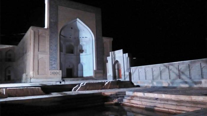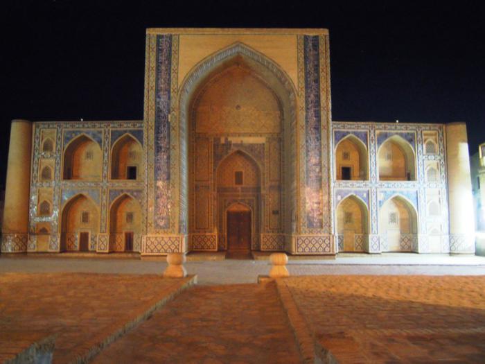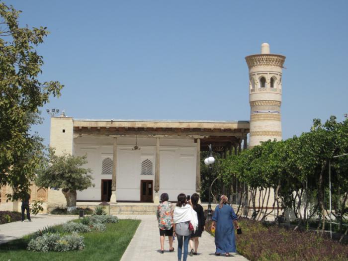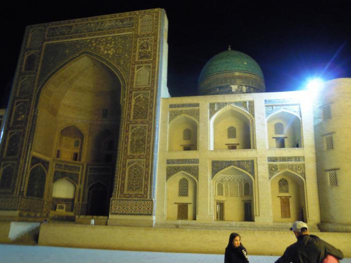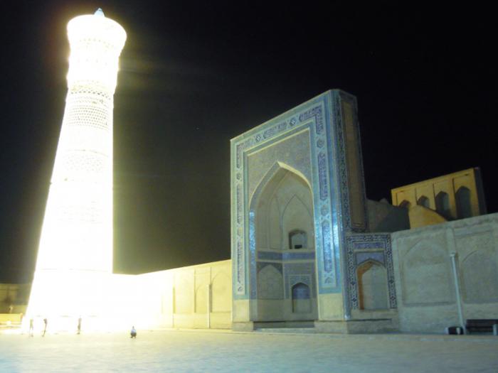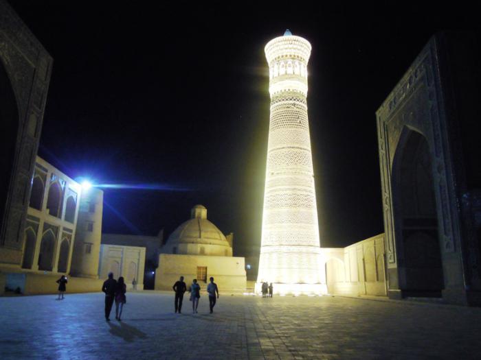 Мы пришли к архитектурному комплексу Пой калян. Пой Калян — архитектурный ансамбль, расположенный у подножия минарета Калян. Комплекс состоит из трёх сооружений, построенных в XII — XVI веках: минарет Калян, мечеть Калян и медресе Мир Араб. Пой Калян находится на парадной площади Регистан и является центральным архитектурным ансамблем Бухары.