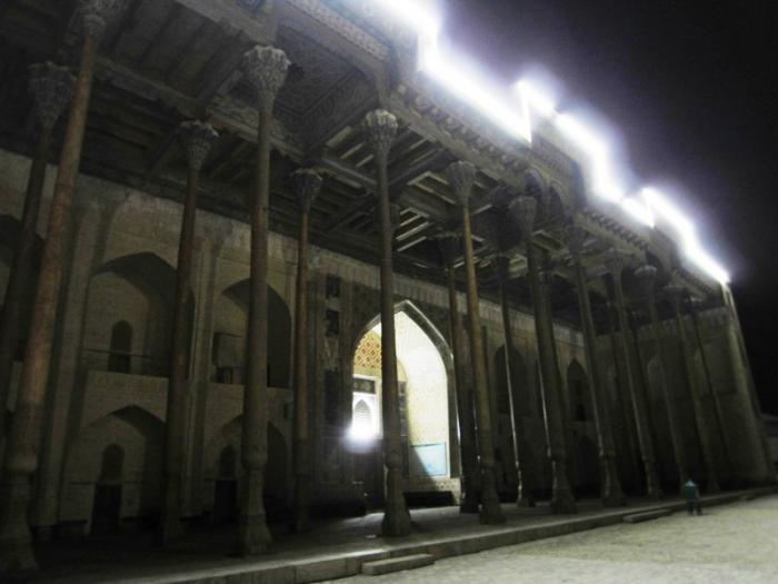 Прошли внутрь крепостных стен. Первое, что мы увидели, это соборная пятничная мечеть — Мечеть Джоме. Построена в начале XVIII века при эмире Субханкулихане (1680-1702 гг). При эмире Алимхана (1910-1920 гг) был произведен капитальный ремонт мечети.