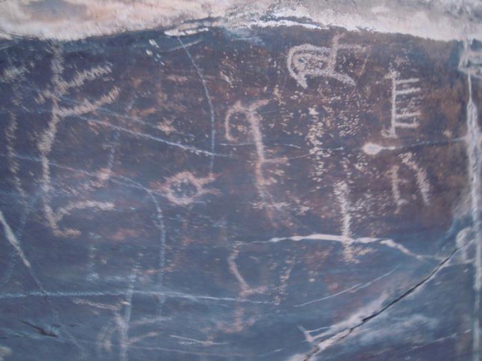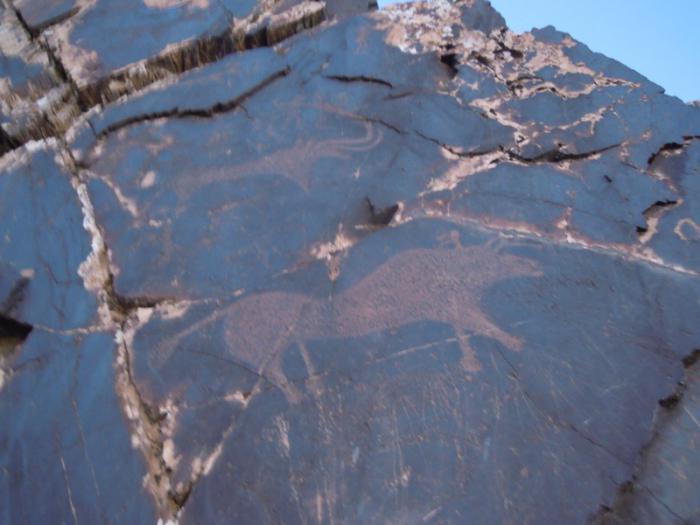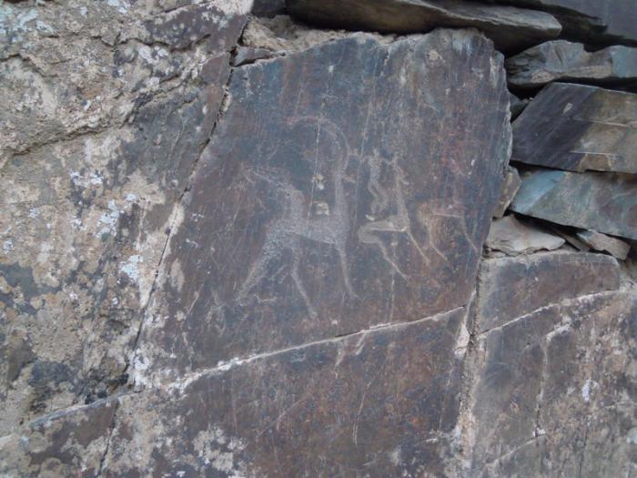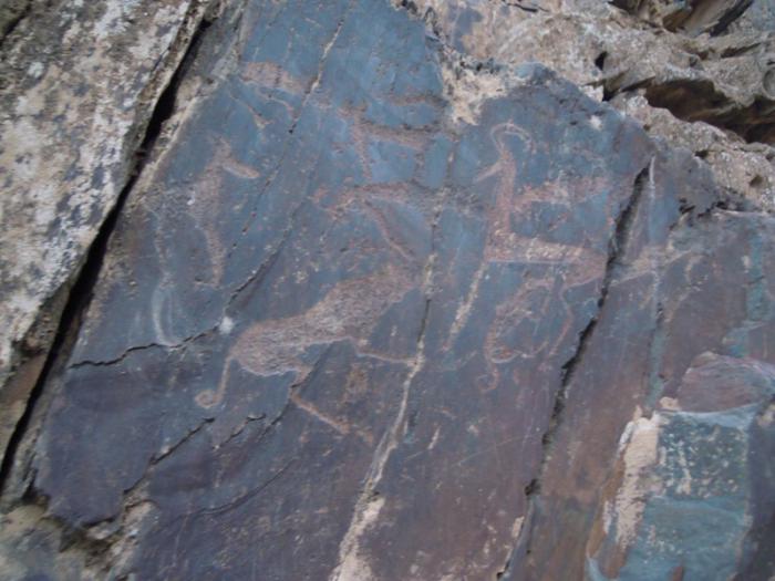 Среди петроглифов — изображения людей и животных (в том числе уже исчезнувших в этой местности), сцены охоты, повседневного труда.