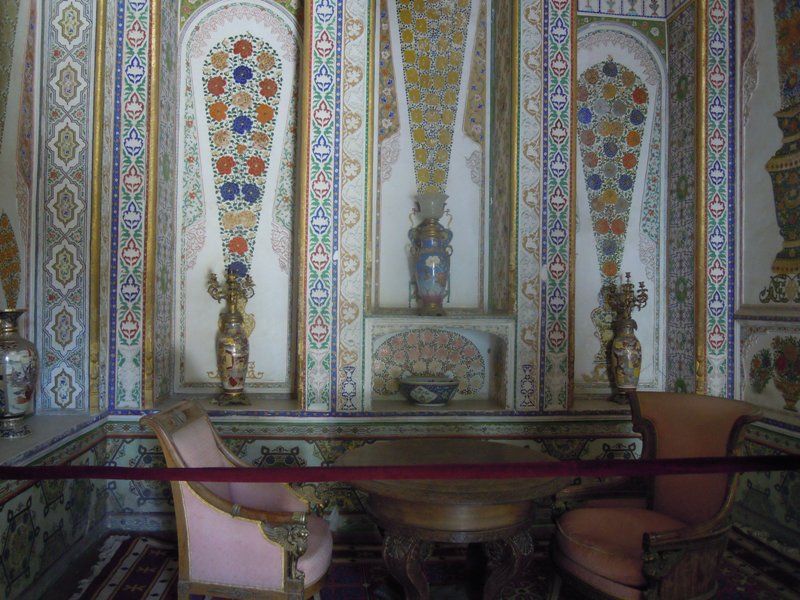 06.09.2018 г. С утра мы поехали посмотреть еще одну красоту в пригороде Бухары — летний загородный дворец Ситораи Мохи-Хоса ( по узб. Sitorai Mohi Хоssа Saroyi — «Дворец, подобный звездам и луне») — загородная резиденция Бухарского эмира, выстроена в конце XIX — начале XX века. В настоящее время в ней располагается музей декоративно-прикладного искусства.
