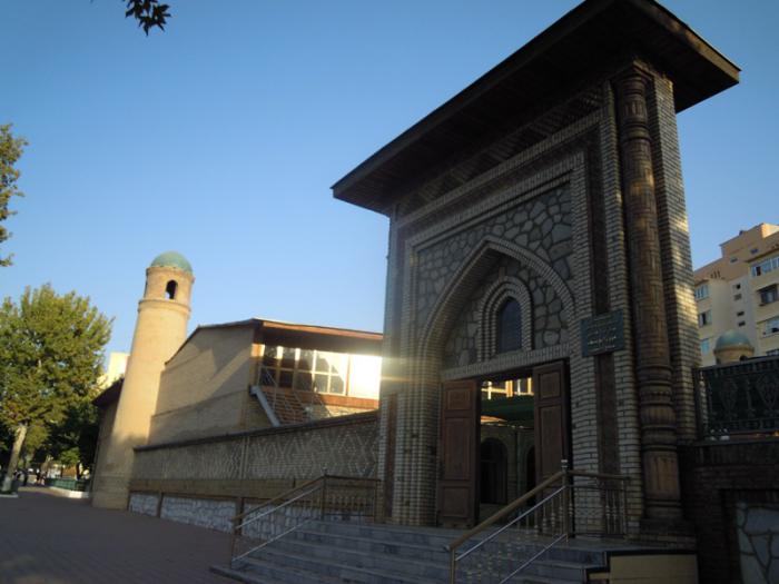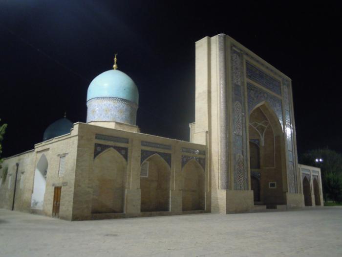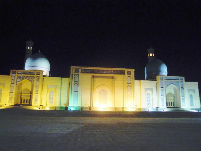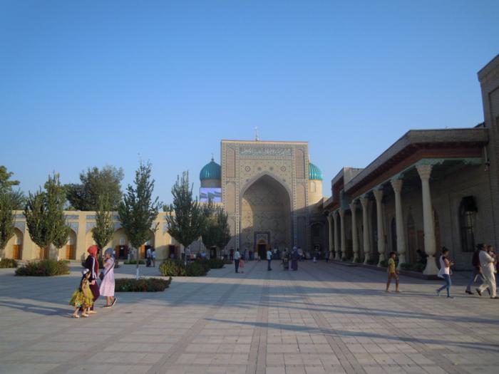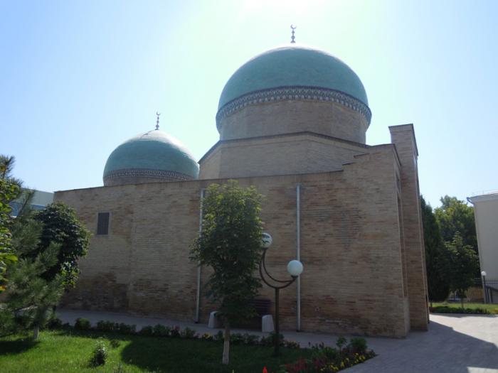 Мы пришли к ансамблю Хазрати Имам. Ансамбль Хазрати Имам — религиозный комплекс в Ташкенте. Ансамбль был возведен около могилы имама города Ташкента, ученого, знатока Корана и хадисов, одного из первых проповедников ислама в Ташкенте, поэта и ремесленника Хазрати Имама (полное его имя — Абу Бакр ибн Исмаил аль-Каффал аш-Шоший). Согласно историческим источникам он был также мастером по изготовлению замков и ключей за что получил прозвище «Каффаль», что означает «Замочник», владел 72 языками и перевел Ветхий Завет (Тору) на арабский язык.