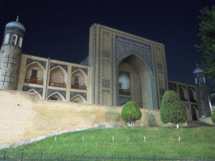 Слева на фото — медресе Муйи Муборак. Медресе возведено в XVI веке. В медресе хранится волос пророка Мухаммеда в связи с чем оно получило своё название. В медресе расположена библиотека Управления мусульман Узбекистана. А справа на фото — медресе Баракхан.