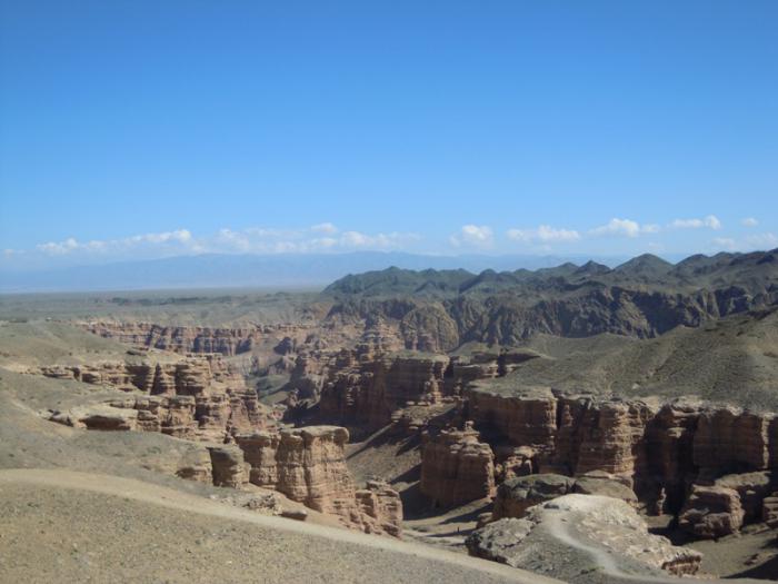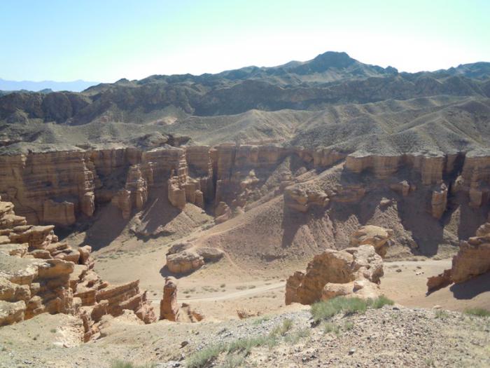 Мы были в полном восхищении от увиденного. Каньон Чарын — протянулся на 154 км вдоль реки Чарын. Мы гуляли по верху. Поленились спуститься вниз и дойти до реки Чарын, которая протекает внизу каньона.