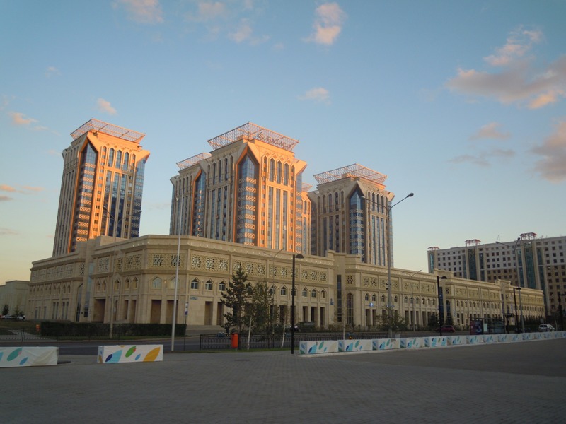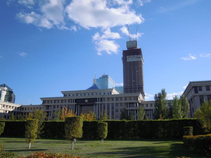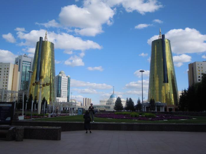Две золотые башни Дома министерств, в народе получившие название «пивные банки», 1998 год. За левой золотой башней — здание Мажилис — нижняя палата Парламента Республики Казахстан, построено в 2004 году. А позади башен (с голубым куполом) — Акорда ( по казахски „Акорда“ — „белая ставка, светлая ставка“) — резиденция президента Республики Казахстан. Официальная презентация нового Дворца президента Республики Казахстан состоялась 24 декабря 2004 года. Здание состоит из пяти надземных этажей и двух подземных.