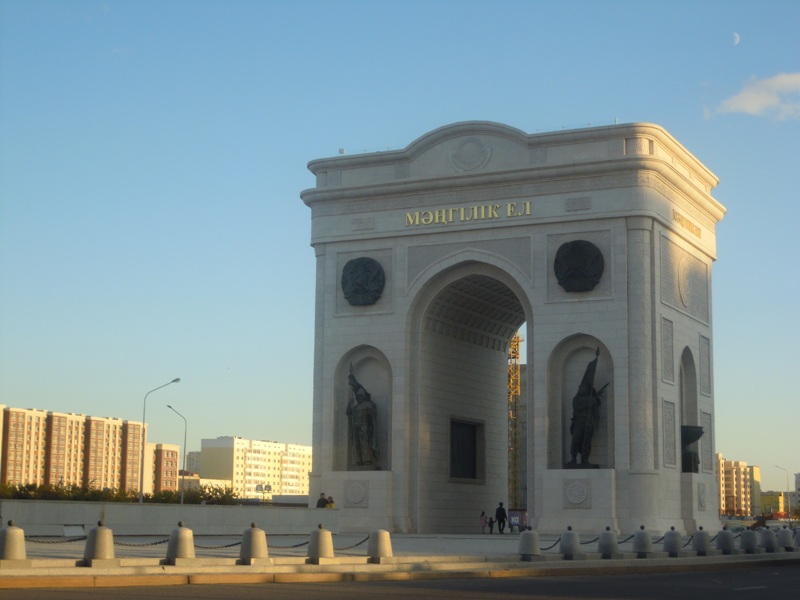 Триумфальная арка «Мангилик Ел». На арке есть надпись «Мангилик Ел»— «Вечный народ». Саму достопримечательность по углам украшают казахские орнаменты. Арка облицована гранитом и мрамором бежевого цвета. В ее нишах расположены четыре фигуры: женщина-мать, как символ домашнего очага; средневековый богатырь, демонстрирующий героическое прошлое Казахстана; аксакал-мудрец, символизирующий мудрость, и современный солдат.
