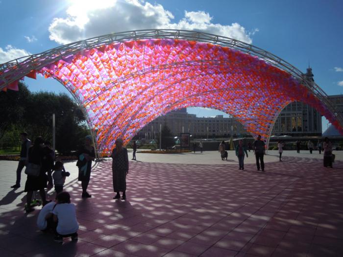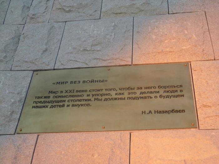 Площадь независимости начинается со Стены мира, который стал подарком Актюбинской области в честь 20-летия столицы.