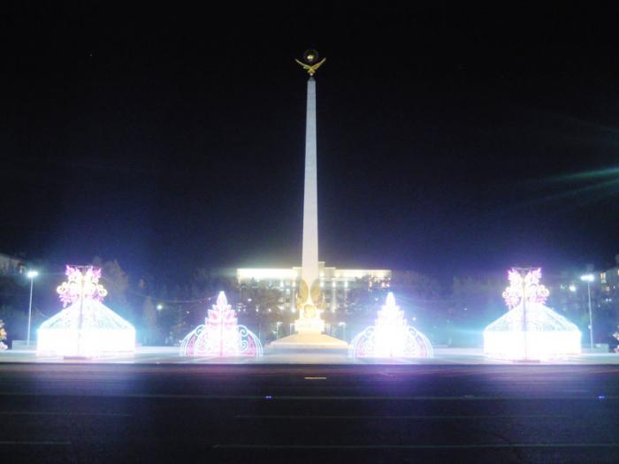 Приехали в центр города. 11 декабря 2011 года в Караганде была торжественно открыта новая стела Независимости, которая возвышается в центре одноименной площади, окруженная живописным сквером с фонтаном.