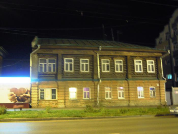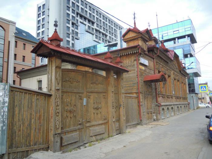 А это — образец богатого уральского купеческого дома. На первом, кирпичном, этаже располагались принадлежавшие хозяину магазины, а на втором, деревянном этаже, — жилые комнаты.