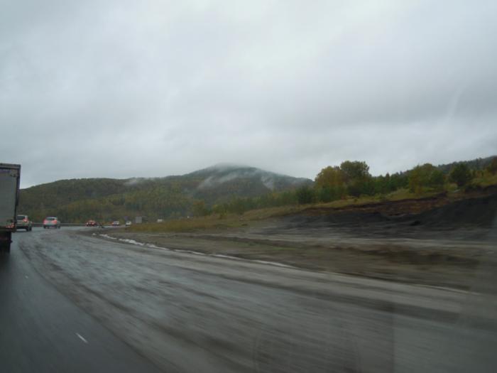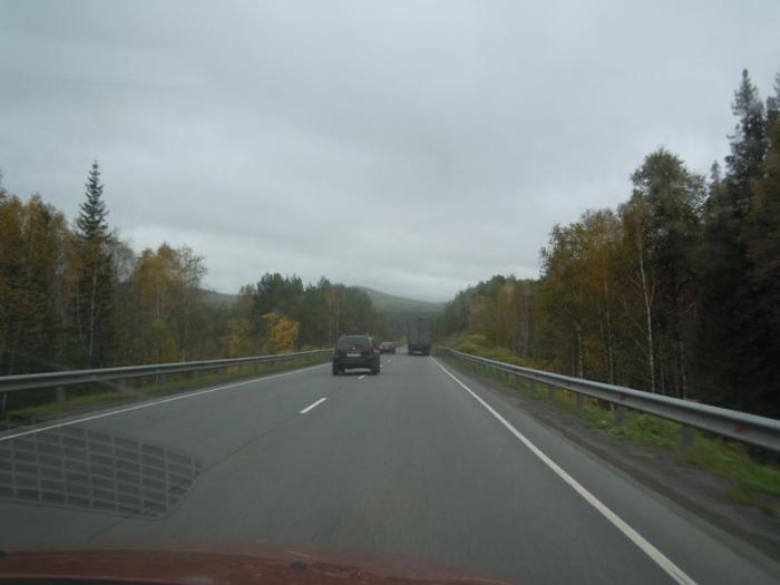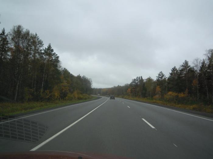 Сначала ехали в горах, Уральских. Шел дождь, был туман, много «дальнобойщиков», ехали небыстро, ну а потом «спустились с гор», поехали побыстрее. Местами дорога была очень хорошая, местами строилась.