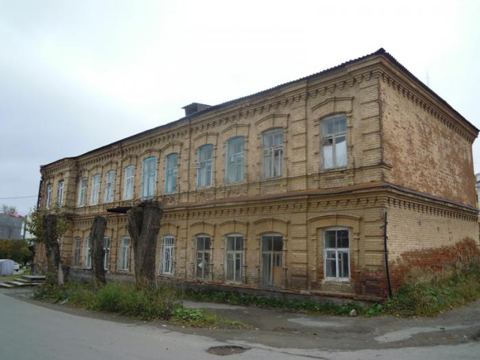 Здание уездного училища, конец XIX века. Здание стало одним из первых каменных домов в городе. Еще в 1817 году в городе было открыто первое учебное заведение — уездное мужское училище. Долгое время училище не имело удобного помещения. В 1857 году Курган с инспекцией посетил директор училищ Тобольской губернии П. П. Ершов, автор сказки «Конек-горбунок», который настоятельно рекомендовал городским властям изыскать средства на приобретение для училища нового здания. В качестве такового был найден недостроенный двухэтажный каменный дом купчихи Фелицаты Васильевны Пелишевой. К 1863 году был достроен антресольный этаж, деревянные постройки во дворе. В начале ноября того же года училище переехало в новое помещение. Раньше вход в здание располагался на ул.Троицкой (Куйбышева) через высокое крыльцо, сильно перегораживавшее тротуар. По этой причине в 1910 году его убрали. С 1914 по 1918 год в здании располагалось Высшее начальное училище. Позднее, в конце 1920-х и начале 1930-х годов, здесь размещалась «семилетка» № 3, кстати, платная, в ней обучались дети состоятельных родителей, лишенных избирательных прав, — «лишенцев», многие из которых позднее были репрессированы. По настоящий день это здание служит детям. Здесь размещается Областная детская библиотека.