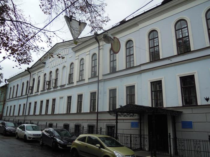 Бывшая Мариинская гимназия. Казанская Мариинская женская гимназия — первая женская гимназия в Казани, основанная в 1859 году как женское училище первого класса, в 1860 году названное в честь императрицы Марии Александровны, супруги императора Александра II. Статус гимназии приобрела в 1869 году. Закрыта в 1917 году, в здании гимназии с 1918 года располагалась единая трудовая школа, далее — советская общеобразовательная школа, в настоящее время — Лицей им. Н. И. Лобачевского при КФУ.