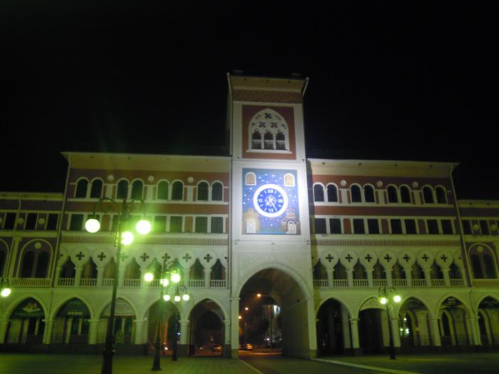 Мы вышли на площадь Республики и Пресвятой Девы Марии. Площадь образована 25 июня 2007 года. Благовещенская башня. Торжественная церемония открытия башни состоялась летом 2007 года. Особенностью Благовещенской башни являются часы, представляющие собой уменьшенную копию московских курантов. Часы имеют 4 циферблата, выходящих на каждую из сторон башни.В башне смонтированы 8 динамиков, благодаря которым раздающийся каждый час бой курантов слышен во всей центральной части города. Показываемое часами время считается наиболее точным в городе, так как корректируется по сигналу спутника.