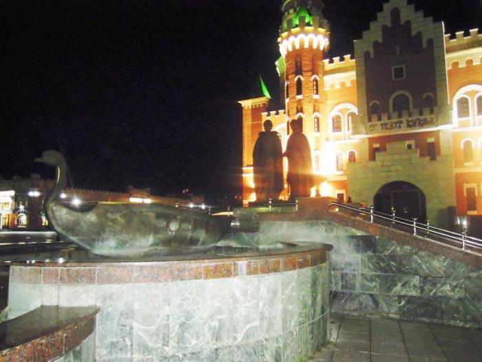 Перед театром находится скульптурная композиция: святые благоверные князь Петр и княгиня Феврония Муромские стоят на небольшом возвышении в начале фонтанной группы, в состав которой также входит лодка.
