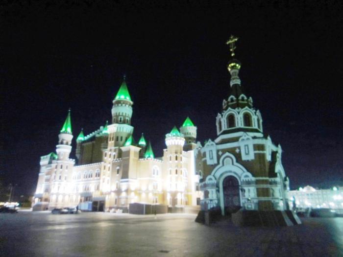 Слева — Республиканский театр кукол, справа — часовня Петра и Февронии Муромских. Расположена на левобережье Малой Кокшаги, на Патриаршей площади. Освящена 08.07.2011 года.