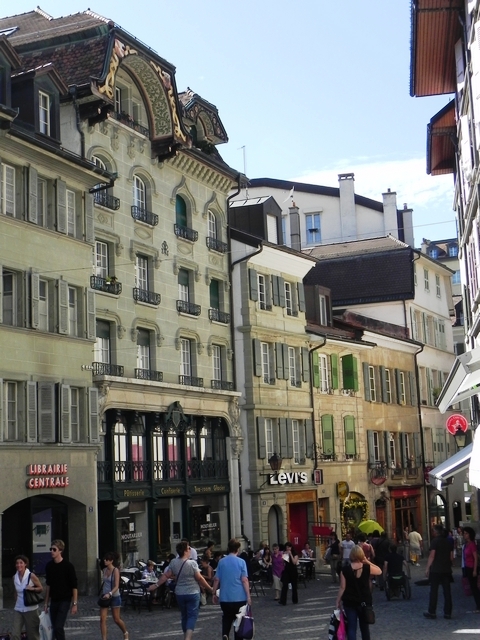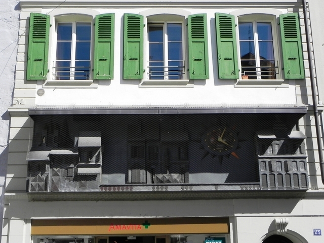 Да и вся площадь уже какая-то более швейцарская что ли. Здесь можно заметить и дома, увенчанные характерными расписными козырьками.