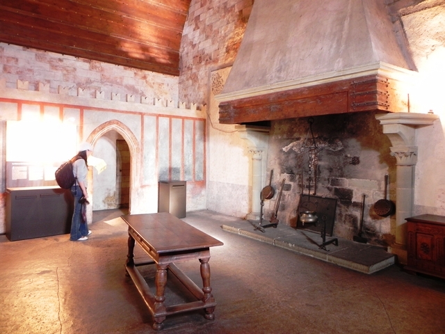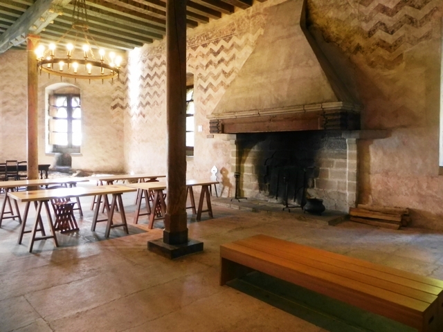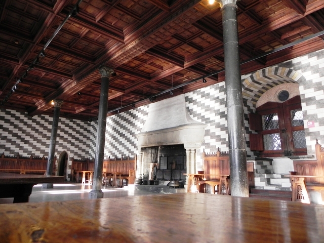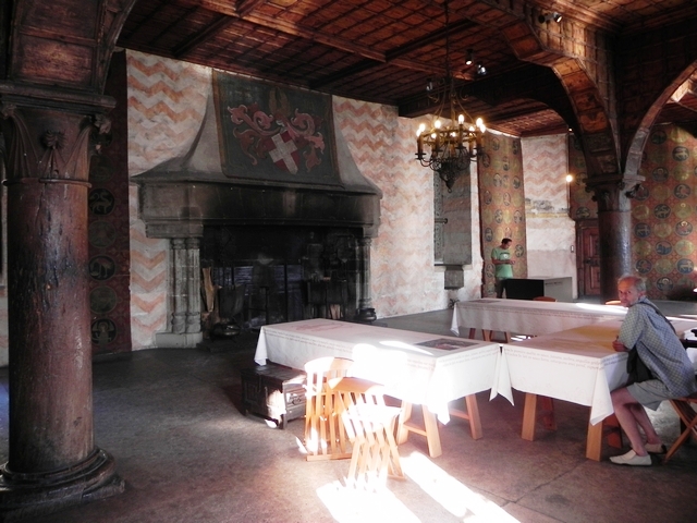 Далее идём в шикарную столовую с кессонным потолком, гигантским закопченным камином и подлинными дубовыми колоннами 13-го века. Жаль, что столы не были накрыты.