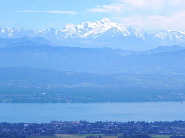 На спуске с перевала Col de la Givrine (1228) глазеть по сторонам было некогда. Лишь завидев скопление туристов на одной из смотровых площадок, решили притормозить. Остановились и ахнули. Перед нашими глазами развернулась фантастическая 3-D панорама: на переднем плане Женевское озеро, а за ним, до самого горизонта, — сплошной частокол из снежных шапок. Казалось, что альпийские вершины выстроились по ранжиру, давая нам возможность увидеть их все одновременно.