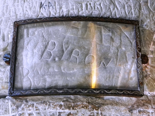 Эта история, пожалуй, не вышла бы за границы современной Швейцарии, если бы не великий лорд Байрон. Видимо, поймать музу за хвост в вечно туманной Англии не так легко. Поэтому, продав своё имение, Джордж, в поисках вдохновения, поселился на женевской Ривьере. С такой логикой трудно не согласиться. Я, например, не сомневаюсь, что, живя в этих райских местах, смог бы писать свои заметки раза в два быстрее. Вот и Байрон, «разнюхав» эту историю, впечатлился, проникся состраданием и моментально выдал на-гора свой нетленный шедевр – поэму «Шильонский узник». Чем и прославил патриота Бонивара, а, заодно, и замок. Поскольку в Советском Союзе любые литературные произведения, герои которых жестоко страдают за дело любой революционной борьбы, издавались в первую очередь, с «Шильонским узником» мы, советские люди, были знакомы с детства. О том, что Байрон был пансексуалом, социалистическая пропаганда скромно умалчивала. В идеологии это не главное. Тем более, что и секса в СССР, как известно, не было. Видимо, такая информация передаётся из поколения в поколение и усваивается на генетическом уровне. Иначе чем объяснить тот факт, что в любом туре по Швейцарии посещение Шийонского замка с неизменным осмотром «автографа» Байрона на одной из колонн темницы входит в обязательную программу. На парковке рядом с замком мы насчитали три туристических автобуса, и все они были с русскоязычными туристами. Поскольку мы с Машей тоже выходцы из «совка», автограф поэта без внимания не оставили.