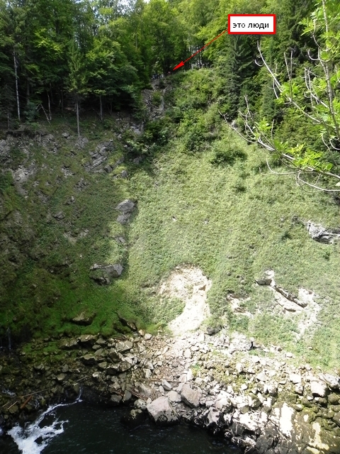 Глядя отсюда на противоположный берег и используя в качестве масштабной шкалы фигуры людей, можно получить впечатляющее представление о глубине пропасти, в которую устремляется водопад.