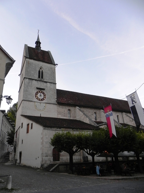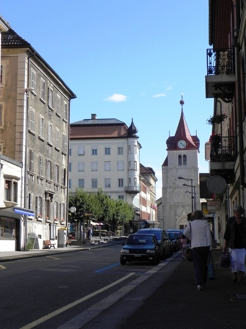 В конце квартала видна башня протестантской церкви. Считается, что это самое старое из находящихся в эксплуатации зданий в регионе Юра. Но мы туда не пошли. Мне кажется, что понятие город-фабрика и религия не очень-то и совместимы.