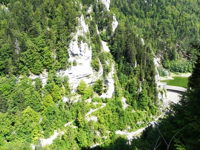 Дамба была возведена в 1953 году и имеет высоту 74 метра. Вода подаётся по трубам на турбины, которые находятся на расстоянии семи километров от плотины. По круто спускающейся вниз тропинке можно было дойти до самой дамбы. Но, несмотря на манящее своим бесподобным изумрудным цветом озеро, мы не пошли. Я предпочитаю сначала подниматься, а на обратном пути спускаться, чтобы можно было без лишних передышек ехать дальше.