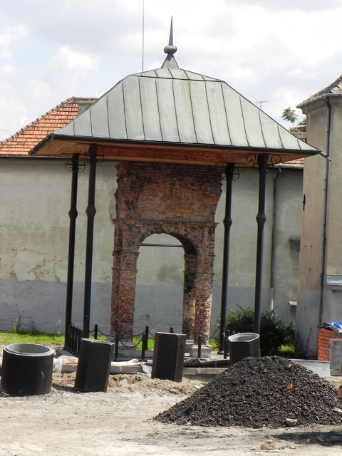Здесь находится бима – всё, что осталось от старой городской синагоги, разрушенной в 1940 году.