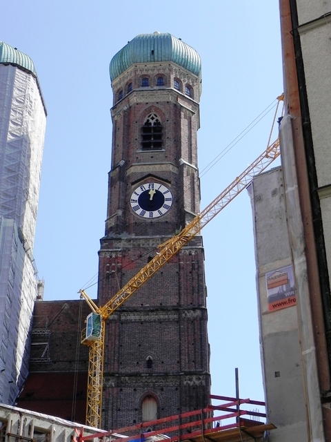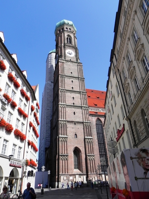 Народу на Мариенплатц много, а толку мало. То бишь, я хотел сказать, что услышать здесь немецкую речь – из мечты. Нет никакого желания долго находиться в этом многоголосом и мультиязычном хоре, поскольку, прежде всего, страдает аутентичность восприятия любой информации. Поэтому мы споренько отправляемся на поиск Фрауэнкирхе. Найти её несложно, поскольку находится церковь совсем рядом, но, к сожалению, на задворках.