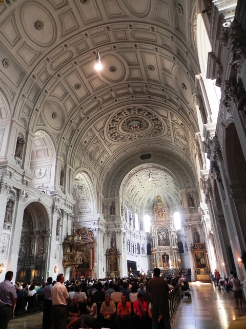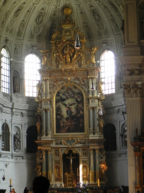 Свод нефа этого храма считается вторым в мире по величине после собора в Ватикане. Сравнивать это заочно просто немыслимо, тем более, с разницей в 15 лет. Но то, что церковь св. Михаила просто огромна – это непреложный факт. Судьба распорядилась так, что мы ранее, вроде бы, не попадали в ренессансные храмы. Всё больше романские, готические или барочные. Поэтому хотелось здесь немного задержаться. Но ждать окончания службы в наши планы не входило. Поэтому, наспех сфотографировав лишь алтарь, мы спешно удалились.
