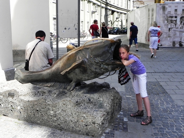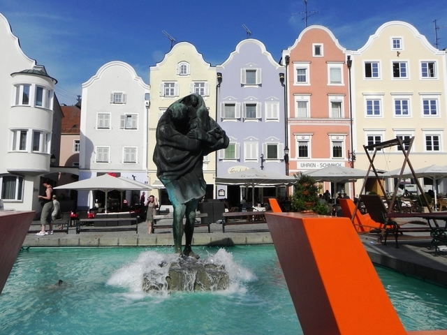 По соседству находится ещё один фонтан – Кристофорусбруннен. Его большой бассейн символизирует, то насколько важна вода для города – судоходство, электроэнергия, целебные источники. А ещё он напоминает об угрозе, которую несут воды Инна – Шердинг часто страдает от наводнений.