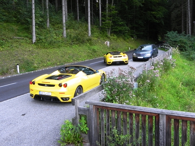 Времени на то, чтобы пускать слюни и в деталях рассматривать всё это благолепие, естественно, не было, поэтому ехали достаточно быстро. В связи с чем едва не зевнули чумовой «view point». Вылетаем на спуске с перевала из лесу, и нашим глазам открывается совершенно противоестественная для этой глуши картина: на обочине дороги стоит парочка ярко-жёлтых «Феррари». Именно на них я и успел среагировать.