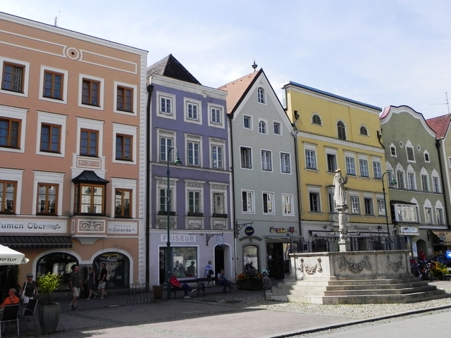 Синий – за пекарями, красный – за мясниками. Жёлтый и зелёный – за владельцами гестхаусов и харчевен. Штадтплац состоит из двух частей. Нижняя, узкий и тесный треугольник, словно шприц впивается своим самым острым концом в городскую набережную. В центре площади находится фонтан св. Георга. Интересный факт: фигура Георгия Победоносца была создана ещё в начале XVII века, но почти двести лет оставалась бесхозной. Водрузили великомученика на нынешнее место после того, как его освободил св. Флориан, переехавший в Замковый парк.