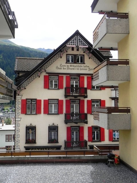 Немного углубившись в эти «каменные джунгли», стараемся в промежутках между домами найти какой-нибудь интересный ракурс. Кое-что удаётся. На южной стороне Альп, возвышающихся над Давосом, можно разглядеть торчащий, словно небольшой прыщик, пик Якобсхорн.