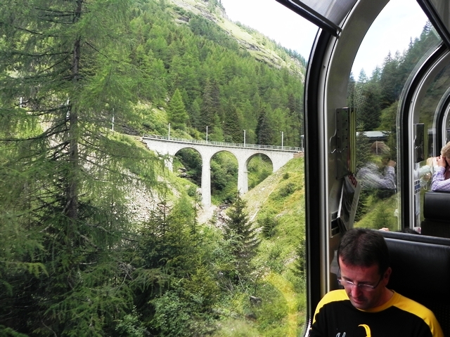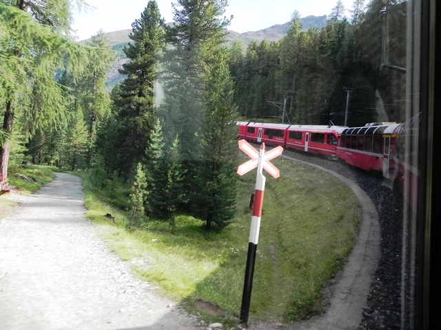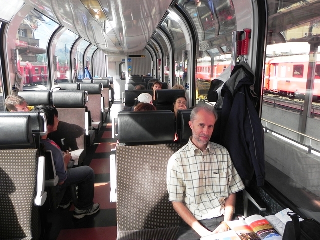 Первый и единственный раз мы просыпались по будильнику. Быстренько перекусив, сворачиваем наш лагерь и уже в девять часов покидаем кемпинг. Путь держим снова в Санкт-Мориц. Ещё накануне я присмотрел паркинг около отеля «Waldhaus am See». Отставив машину на свободном месте, спешим на вокзал. Сегодня сбудется ещё одна моя мечта – мы отправляемся на знаменитом панорамном поезде «Bernina Express» в поездку по маршруту Санкт-Мориц – Тирано. Для Маши это было сюрпризом буквально до последней минуты. Занимаем места у окна согласно купленным билетам и ждём отправления поезда.